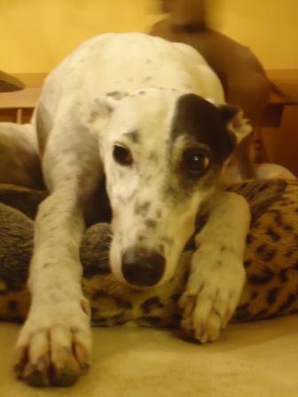 Die Greyhound-Hündin Crimi, zwölf Jahre alt, kam über zwei andere Länder zu uns. Sie war in einen Hasenzug gelaufen, was ihr eine Brandnarbe auf dem Rücken einbrachte. Beim Spaziergang auf der Pflegestelle rutschte sie in vollem Lauf aus, fiel der Länge nach hin und zog sich einen Bluterguss im Rücken zu. Sie war wie gelähmt. Dass dem nicht so war, zeigte sich beim Tierarzt. Trotzdem dauerte es noch mehrere Wochen, bis Crimi wieder Laufen konnte. Man merkt es ihr noch an, Treppen z.B. geht sie eine Stufe nach der anderen hoch. Aber sie hat Lebensfreude und was für eine, Crimi kennen wir stets nur gut gelaunt.