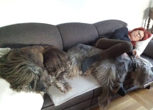Was unser Bild betrifft: So sieht es in einem iWi-Haushalt aus, wenn Tochter (mit ihren zwei Afghanen) ihre Eltern besucht und die Mama am Ende mit zumindest zwei Afghanen auf dem Sofa verendet :)