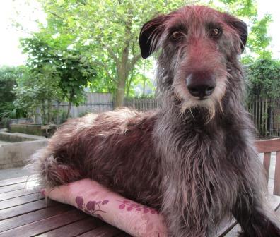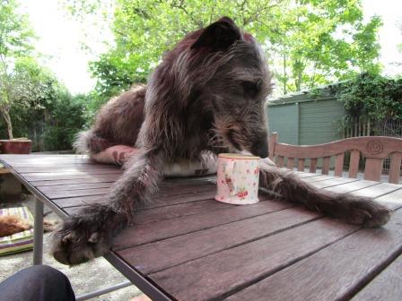 Nur, weil Feiertag ist - hier ein Deerhound, der auf dem Gartentisch unseren Milchkaffee schlürft. Ok, eigentlich ist er zum Spüldienst eingeteilt...