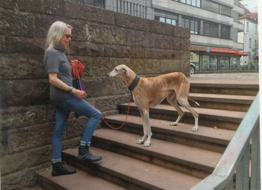Wir laufen jeden Tag mindestens eine Stunde, er im Sturmschritt an einer 15 m-Leine voraus, dann pfeife ich, er bleibt stehen und kommt dann. So trainiere ich ihn, denn er möchte rennen und spielen mit den anderen Hunden, aber noch traue ich mich nicht, ihn frei laufen zu lassen. Er erschrickt schnell vor anderen Menschen, bellt jetzt auch mal solche an, die auf mich zukommen.