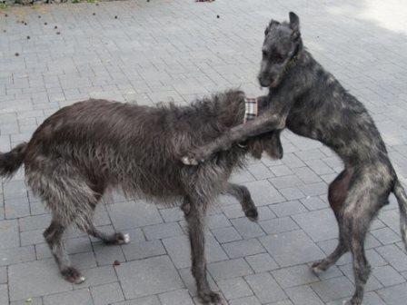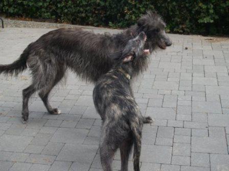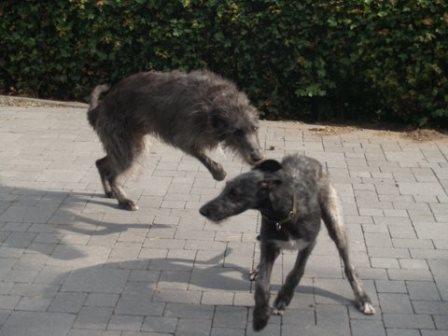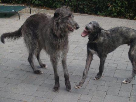 Passend dazu hat uns Alexandra aktuelle Fotos von Ferdi (verm. 03/2014) geschickt. Ferdi hat einen Kumpel bekommen, nun sinds drei Deerhounds... jaja... Alexandra rief einst bei uns an um sich nach einem Deerhound zu erkundigen, einfach so, damals war keiner in der Vermittlung. Sie hatte einige Galgos, wir meinten, dass die Galgos mit der Wildheit eines Schotten nichts anzufangen wüssten.... Alexandra rief das nächste Mal an, als wir Ferdi in der Vermittlung hatten. Sie hatte sich inzwischen einen Schotten gekauft und festgestellt, die meisten ihrer Galgos treten spontan die Flucht an, wenn der loslegt :-) Nun passte Ferdi wie die Faust aufs Auge und jetzt kam nochmal ein Welpe dazu.