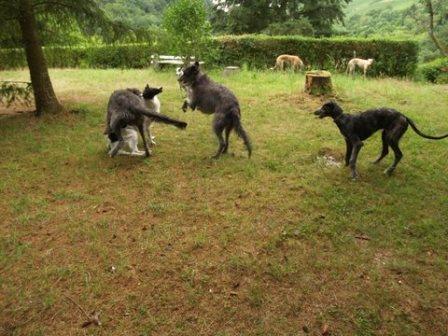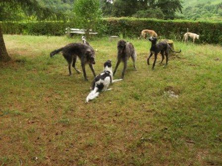Und zwischen Ferdi und seinem neuen Kumpel kam noch das Barsoimädchen Ivy im September 2014 zu Alexandra. Sie war bei Abholung von Ferdi vollauf begeistert von der hübschen Maus, die zwar ein krummes Bein hat, aber trotzdem flitzen kann und sich sooo toll mit Ferdi verstand. Es rumorte dann noch ein wenig im Herz und im Verstand... und seitens der besseren Hälfte... bis dann Ivy zu Ferdi ziehen konnte.
