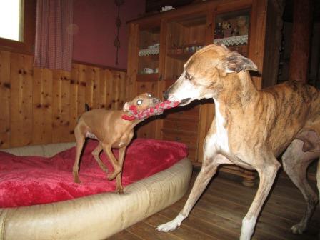 Eine ganz besondere Freundschaft hat sich auf unserer Multikulti-Pflegestelle entwickelt, das kleine Windspielbüble Remo spielt am Liebsten mit dem Azawakh Bashou.