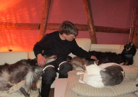Andrea hat ja bereits einige Barsois von uns gehabt und beherbergt noch das Flöckchen. Irgendwann vor geraumer Zeit hat sie noch zwei Jungbarsoile bei sich aufgenommen, so sind es jetzt mit Socke und Mütze fünf an der Zahl.