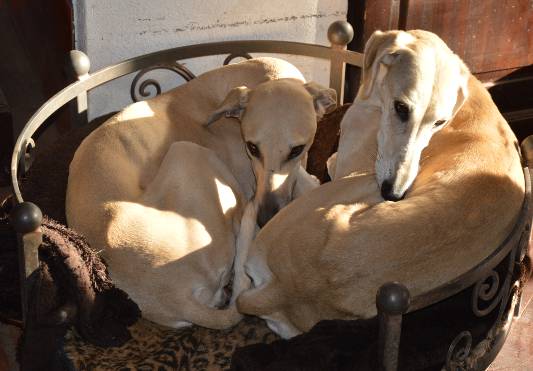 Hier noch ein Schnappschuss von Muriel, die hier noch mal anmerken möchte, daß sie furchtbar gerne zu einem anderen Kurzhaar-Windhund ziehen möchte, die Rasse sei ihr herzlich egal.... Aber auf einen/eine zum Kuscheln möchte sie nicht verzichten.