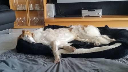 "Tägliches Ritual...Fabergé liegt irgendwo, hebt den Kopf, kuckt nach mir... sobald ich das bemerkt habe, wird ganz wild mit dem Schwanz geklopft, dann muss ich mich zu ihm setzen und massieren. Z.B. Kopf oder Wirbelsäule oder Hinterschenkel... nach ca 2 Minuten gehen Augen zu... dann döst er richtig weg... grunzt ab und zu mal laut... das mach ich dann ne halbe Stunde. Sobald ich langsamer massiere, hörst kein atmen mehr... und sobald ich es wage aufzuhören, fährt der Kopf hoch, kuckt mich vorwurfsvoll an und klopft wieder mit dem Schwanz. Ein richtiger Genießer. Ich genieße diese Momente auch immer sehr.