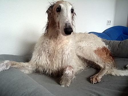 Der 6.4.2013 war wieder so ein Tag, an welchem ein iwi-Taxi in mission Greys und Barsois auf Deutschlands Autobahnen unterwegs war. Mit Zwischenstop bei mir, Pflegestelle für ein kleines weisses altes Barsoimädchen mit rotem Popöchen. 9,5 Jahre alt, bestimmt findet sich noch ein nettes Rentnerplätzchen.