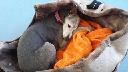 Hier liegt sie in ihrer Tasche beim Tierarzt, sie ist ja kein Schoßhund, mag das gar nicht und gibt das auch lauthals zu verstehen.