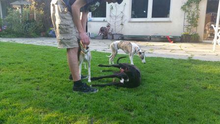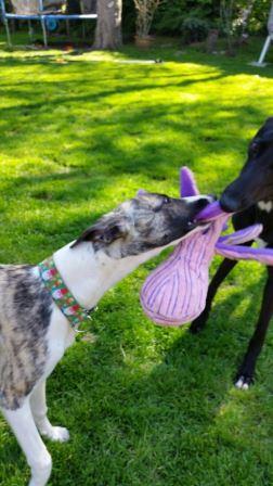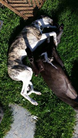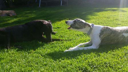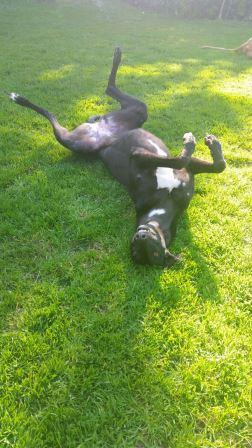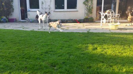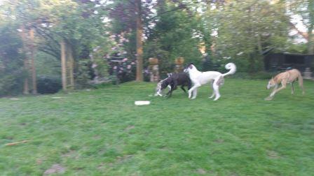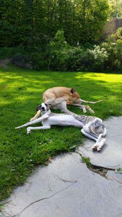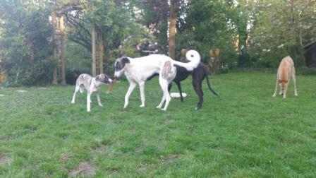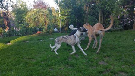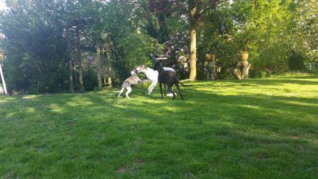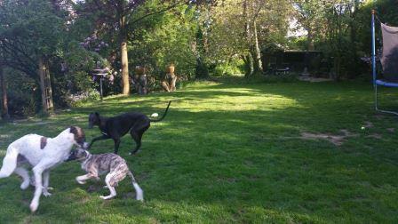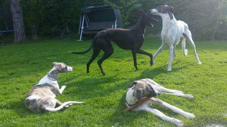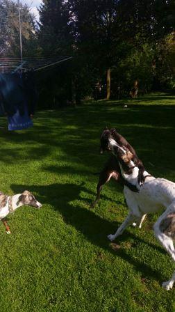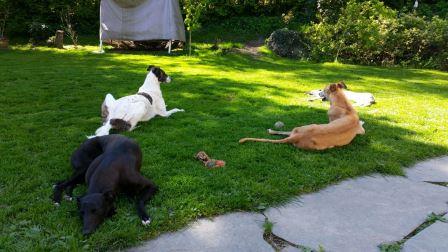Schaut euch doch mal diese herrlichen Bilder an. Diese Meute hat einen Riesenspaß. Das gilt nicht nur für die Jungspunde Honey-Amy, Matteo und Carino, auch für Jonas und den alten Spicy ist ein Garten ein Riesenstück Freiheit und Genuß. Und dass wir uns genau SO ein Leben für alle unsere Hunde wünschen, ist doch nichts Ärgerliches. Schließlich vermitteln wir ja auch an Menschen, die keinen Garten besitzen:-)