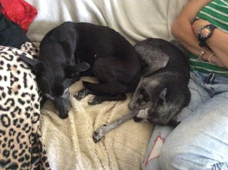 Ein Sofabild von Uhla, 14, taub und ihrer neuen Freundin Sheba, 15 und einäugig. Liebe Ute - schön, dass es dich gibt!!