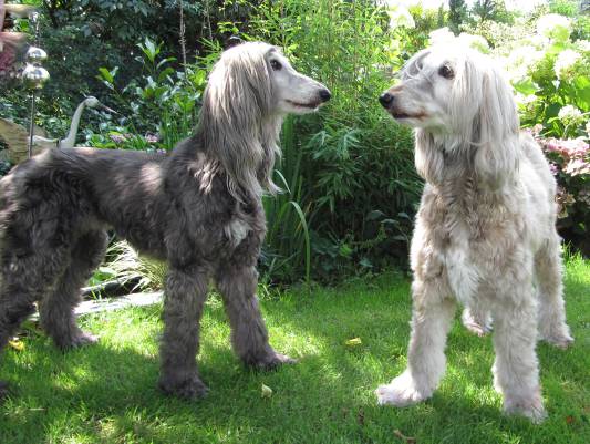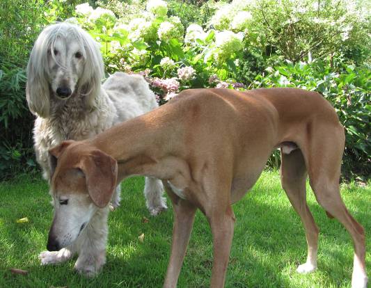 Wir übernahmen mit Überzeugung zwei alte und schwergewichtige Afghanen-Damen und freuten uns auf die Komplettierung unserer Rentnerband. Jetzt nach einem halben Jahr ist klar: schnuckelig und richtig liebenswert - ja; alt - ja; schwergewichtig - war gestern. Alice mischt uns und die Jungs richtig auf, sie hat Temperament. Nushnush dagegen ist neugierig und eine vorsichtige Entdeckerin. Wir hatten Besuch von einer zurückhaltenden Afghanen-Dame, die ebenfalls von der IWI vermittelt wurde. Während diese von unseren anderen drei völlig unbehelligt den Garten inspizieren konnte, machte Alice richtig Randale - hier kommt kein Hund mehr rein - und verzog sich danach protestierend ins Haus. Einerseits bin ich begeistert, dass sie soviel Energie entwickelt, bedaure aber, wenn sie netten Hundebesuch ablehnt. Aber vielleicht legt sich das noch. Auch bei Menschenbesuch entscheidet sie sofort und eindeutig wie Tenner, wen sie mag oder nicht. Sie kann dann richtig handgreiflich werden, wenn der Mensch nicht verschwindet. Tenner hat hier einen echten Kumpel gefunden und wir sind das gewohnt.