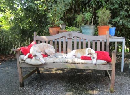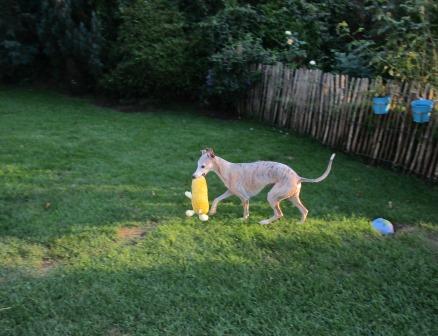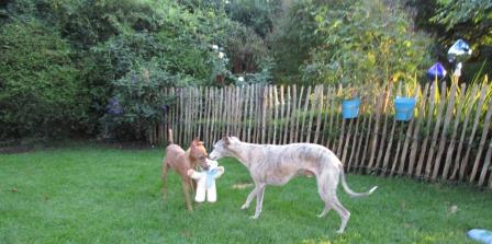 Floyd ist definitiv KEIN Einzelhund. Plötzlich hat es ZOOOOOOM gemacht und er ist ein völlig anderer. Er spielt und rennt mit den anderen durch den Garten, macht Zerrspiele mit den Kuscheltieren, kuschelt am Liebsten mit einem anderen im Körbchen, vorwiegend derzeit mit dem Paten-Pimpelchen, ja - einem Rüden - und das Beste: Er kommt zum Schmusen. Floyd wird also ein ganz normaler Whippie und darüber sind wir sehr glücklich. Immerhin hatten wir bisher noch nie so einen Whippet. Wollte nicht aufs Sofa, wollte nicht gestreichelt werden, schlief den ganzen Tag oder fing Mücken. Ein sehr merkwürdiger Whippet.