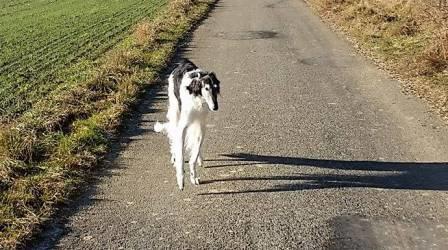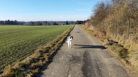 Im Oktober 2008 kam der damals sieben Monate junge Dymas mit kaputten Vorderbeinen bei uns an. Nach einer Operation fand er ein halbes Jahr später ein tolles Zuhause auf der Schwäbischen Alb. Mit Fotos war sein Besitzer immer schon geizig :-) Aber neuerdings ist man ja bei Facebook und so haben wir heute mal einen Schnappschuß vom Spaziergang bekommen.