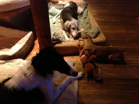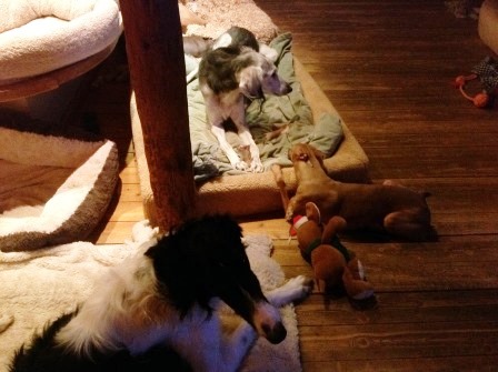 Unser fünfzehnjähriger Paten-Saluki Cal scheint seit Weihnachten in einen Jungbrunnen gefallen zu sein. Er hüpft fröhlich vom Garten ins Haus und rast zu seinem Bettchen, in das er sich dann kopfüber stürzt, so dass mancher Besuch uns nicht abnimmt, dass Cal ein alter Opi ist:-)