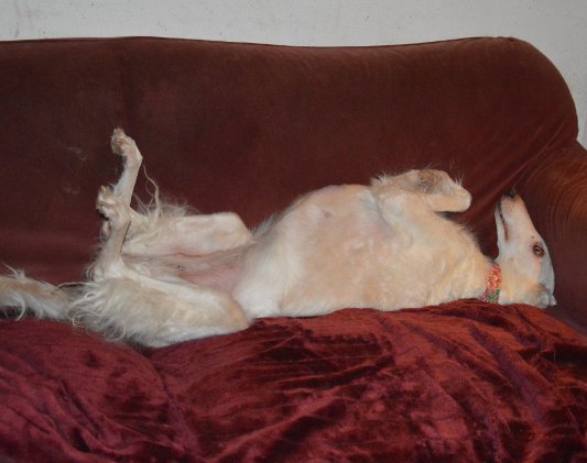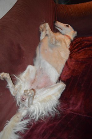 Wie es uns scheint hat sie sich bereits recht gut bei und eingelebt und fühlt sich aus zusehends wohler. Sie ist eben ein echtes Barsoi-Mädle, das ihren Unmut so laut kundtat, daß wir ziemlich verunsichert waren, ob ihr denn was Ernsthaftes fehlen würde.
