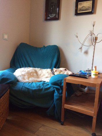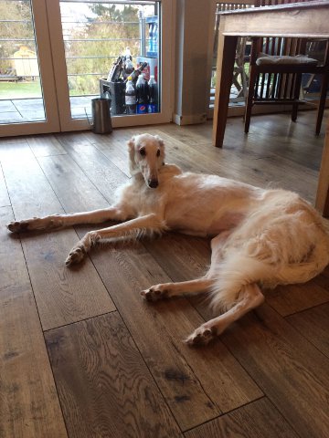 "Alles gut hier. Sie hat die Nacht bei Lea im Bett tief und fest geschlafen und ist heute Morgen ausgiebig auf Erkundungstour gegangen. Die Jungs tanzen den ganzen Morgen um sie herum. Afghane Orpheus singt ihr Liebeslieder und ist jetzt völlig fertig :). Was so ein alter Mann nochmal aufdreht, wenn ein Mädchen kommt. Jetzt ist allgemeines Kaputtsein und Schlafen angesagt. Für den Kater interessiert sich Mira überhaupt nicht."