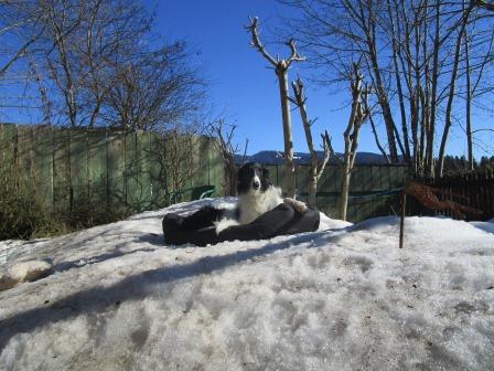 Derweil genießt er noch ein paar Sonnenstrahlen auf seinem Schneehügel. Wir haben dort extra für ihn ein Bettchen deponiert, sonst liegt er auf dem Schnee. Bissle Luxus muß sein.