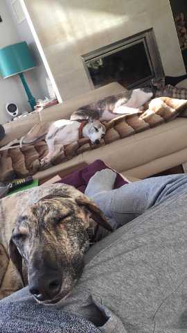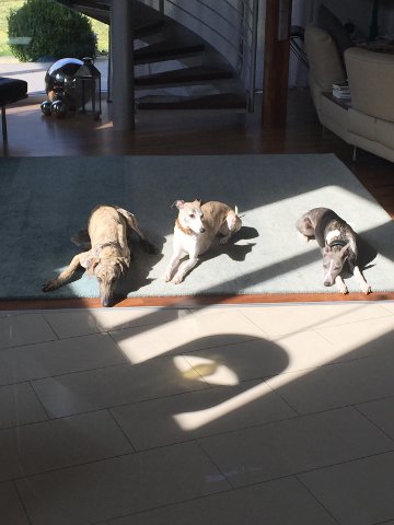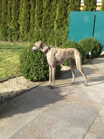 Und auch unser Sloughi-Bub Largo hat es geschafft; er zog bereits letztes Wochenende in die Pfalz zu zwei hübschen Whippet-Damen (manchmal hat es ja auch so seinen Vorteil, wenn ein Hund kastriert ist) mit Haus und Garten und zwei netten Jungs.