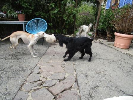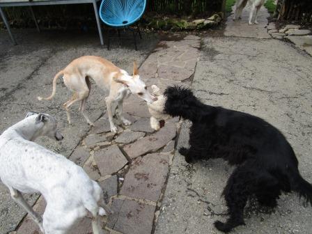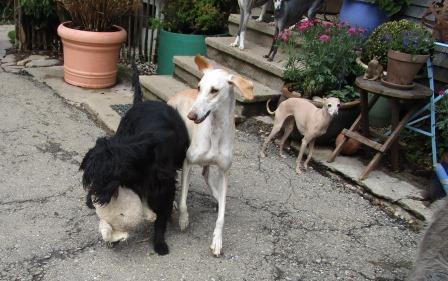 Jetzt hatte ich aber Schiss, Daisy einfach so aus dem Bus zu holen. Also bugsierte ich sie in eine Box (ich hasse Boxen, Boxen und Trichter braucht doch kein Hund!) aber sie wollte gar nicht mehr raus... ich schüttete sie dann einfach im Garten aus, sie rutschte samt der Decke ins Gras. Und natürlich hatte ich eine Schleppleine an ihr Halsband gemacht. Begrüssung mit dem Rest, alles superfriedlich. Meine Hunde sind es ja gewohnt, ständig neue Mitesser :-) zu bekommen, mancher steht gar nicht mehr vom Sofa aus und scheint zu sagen:" Hi, nimm Platz und halt die Klappe."