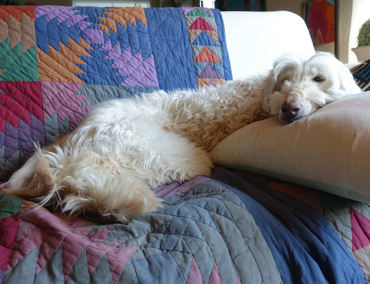 "Auf dem Foto siehst Du die Angie, (ist sie nicht bildschön geworden), sie verbringt die Hitze in den Kissen, sie geht um acht Uhr am Morgen spazieren, nachher gibts nur noch Schatten im Garten, sonst streikt sie und sieht uns an, so wie auf dem Foto. Es geht Angie sehr gut sie war noch nie krank und trotzdem sie im Garten immer Gras isst, war ihr noch nie schlecht, sie ist der wahre Traumhund, nur wenn Besuch da ist, (auch die Nachbarinnen die sie jeden Morgen wedelnd begrüsst) Gärtner oder Putzfrau da ist, kann sie locker vier Stunden bellen und bösartig knurren, wenn die in ihrem Garten oder Haus sind, und das nervt gehörig. Alles was wir versucht haben ist fehlgeschlagen...und nun finden wir uns halt ab...und der Roland hat ein Riesenverständnis, und das ist gut so, die beiden sind immer zusammen, jetzt ist es 35 Grad heiss und die beiden sehen sich im Fernsehen etwas an, möge sie noch lange leben die Angie (und auch der Roland natürlich).
