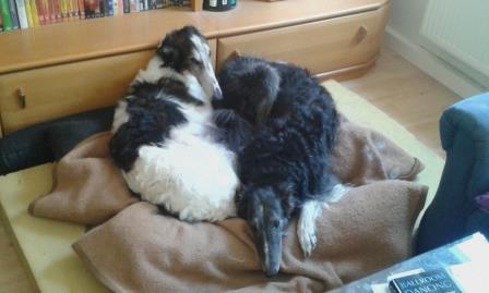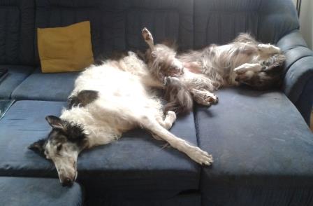 Die Spaziergänge mit den beiden Buben sind einfach nur erfrischend und machen so richtig Spass. Herbert läuft, bis auf Wegen mit starker Radfahrerpopulation und an Strassen, immer ohne Leine und das funktioniert wirklich traumhaft; so kann er schnüffeln so wie ihm beliebt - ich hab das Gefühl, dass er die verlorenen Jahre seines Lebens "nachschnüffeln" muss; er saugt praktisch das Leben, die Natur und seine Umwelt in sich ein. So ab und an muss ich schon stehenbleiben und warten, weil er vor lauter Schnüffelei alles um sich herum, sprich mich, vergisst. Auf Rufen und Pfeiffen von mir reagiert er schon relativ gut - nicht dass er gleich kommen würde (ein Barsoi, der auf Pfiff kommt wäre auch echt eine Rarität und wird auch völlig überbewertet), aber er spitzt zumindest die Ohren und schaut, wo und ob ich überhaupt noch dabin. Aber die Bindung ist doch schon so stark, dass er angaloppiert kommt, wenn ich zuweit weg bin oder er mich nicht mehr sieht ... er ist einfach ein ganz besonderer Hund. (Anmerk. der Red.: JA, da hast du wollkommen Recht!)