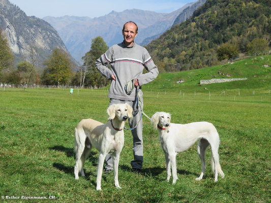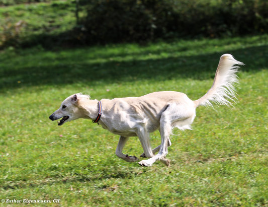 Stellt Euch vor, dass wir bereits am ersten Wochenende zufällig die Möglichkeit erhalten haben einen Probelauf auf der Bahn zu laufen, was bereits bis zur Hälfte geklappt hat. Einige Tage später ist Shari dann bereits von alleine ohne irgendeinen Hasen oder etwas Aehnliches eine Runde für sich gerannt. Das ist unglaublich. Und vorletztes Wochenende am Coursing habe ich mir als Platztierarzt jeweils einen Probelauf samstags und sonntags erarbeitet. Davon schicke ich Euch einige Aufnahmen (die nicht von mir gemacht sind). Mit Yasher versteht sie sich sehr gut. Sie hält ihn ganz schön auf Trab.