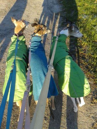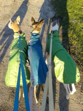 Unsere beiden Whippetoldies Jasko (links) und Dajak (rechts) haben wunderschöne Mäntelchen von ihrer Pflegemama genäht bekommen - jetzt können sie topchic spazierengehen, die grünen Männchen:-)