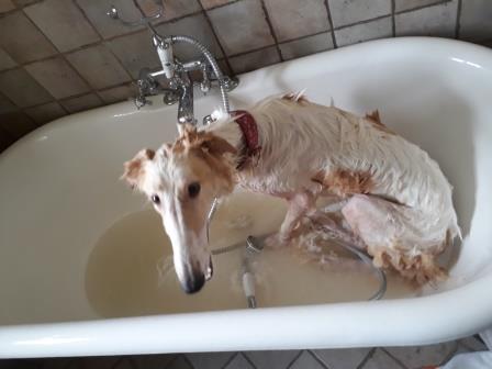 Eine 2 Jahre junge Barsoihündin in weiß mit hellroten Platten mit dem schönen Namen Melodie (siehe Fotos) und einen bildschönen, fünfjährigen Greybuben in rot, den wir schon mal kurz hier vorgestellt hatten: Blitzeblatze.