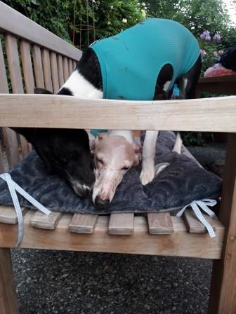 Zuhause setzten wir sie also neben Hilde auf die Gartenbank und Imba hüpfte daneben, um ihre Freundin schön sauber zu machen. Als wir abends ins Bett gingen, fanden wir Vicky in einer Blutlache und riefen völlig panisch unseren Tierarzt an, Hilfe, Blutlache, Angst, dass Vicky heute Nacht stirbt, weißes Zahnfleisch, völlig apathisch!