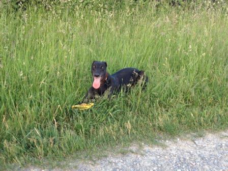 Unser einziges Problem im Moment: die Hitze… Ihr Lieblingsplätzchen sind die Küchenplatten geworden und jede Art von Wasser wird genutzt zum Baden. Ob See, Bach oder Pfütze, sie findet immer einen Weg mindestens die Pfoten reinzustellen und zu plantschen. Und sie schätzt es sehr, wenn sie sich nach dem Spaziergang im Garten unter den Wasserschlauch stellen kann um ein bisschen abzukühlen.