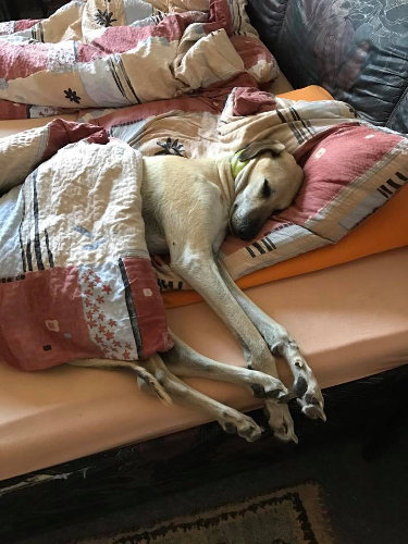 (vermittelt Mai 2010) grüßt von seiner nächtlichen Schlafstätte. So muß ein Sloughi-Leben aussehen :)