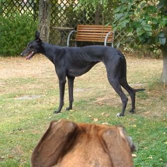Von hier schicken wir Dir sonnige Septembertage! Der wunderhübschen Lady Saphire geht es bestens, und sie genießt Spaziergänge, Schmuseeinheiten, Quietschies, große und kleine Freiheiten. Da sie im Freilauf gut berechenbar ist und aufmerksam auf Zuruf reagiert, darf sie sogar im Wald ohne Leine laufen. Das kann ich dort Kumpel Fly nicht erlauben; der Oberjäger muss an der Leine bleiben. Sobald er einen langen Hals und eine noch längere Nase bekommt, wissen wir, dass Wild nicht weit ist, dann wird Saphi auf alle Fälle auch fixiert. Die Fotos aus dem Garten zeigen die beiden im Pirschmodus, denn außerhalb des Zaunes hatte sich