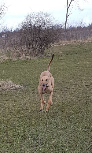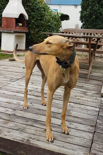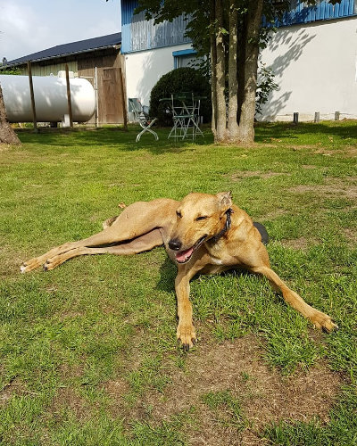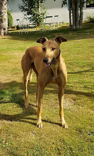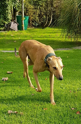 Sie fühlt sich wohl und strahlt es aus, hört gut, außer windhundtypisch oder Reh, Hase oder Katze laufen davon. Dann muss sie sich hinsetzen, was manchmal schwer fällt.