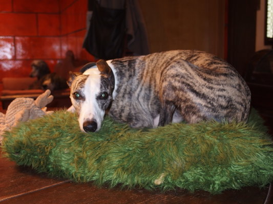 Also der hauseigene Whippet Beanie (vermittelt 2010) kann auch unsere anderen Rassen zum Kuscheln ganz gut leiden; und wenn sie ihre Ruhe will, da hüpft sie eben auf ihr Kissen auf dem Esstisch :)