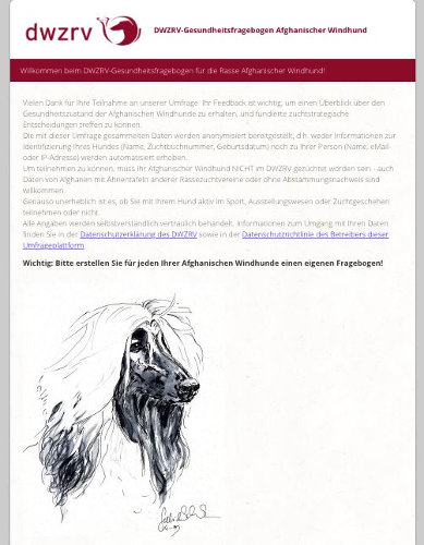 Für viele Rassen existieren diese Fragebögen schon länger, doch für die Rasse Afghanischer Windhund ist er relativ neu. Da wir in unseren Reihen recht viele Afghanen-Besitzer haben, möchten wir diese bitten an dem Gesundheitsfragebogen für ihre aktuellen (aber auch verstorbenen) Hunde teilzunehmen.