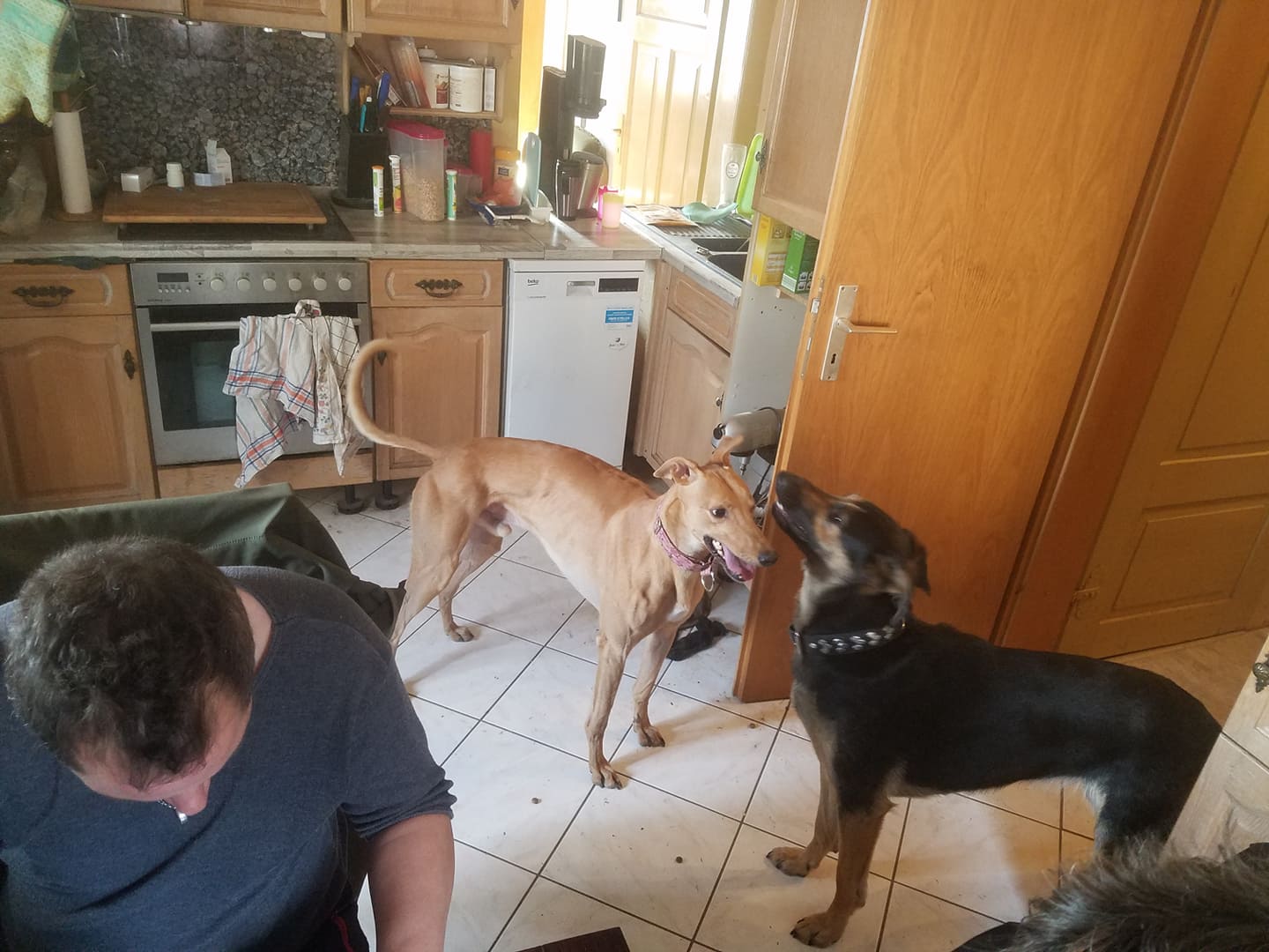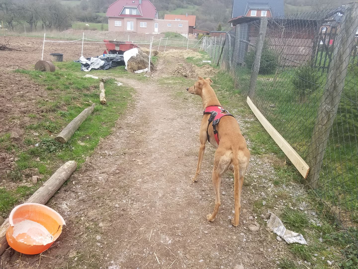 Blitzi lebt nun mit einem älteren Galgo-Grey-Mix und einer jungen Schäfer-Mix-Dame auf einen riesengroßen Hof (zumindest aus schwäbischer Perspektive J ).