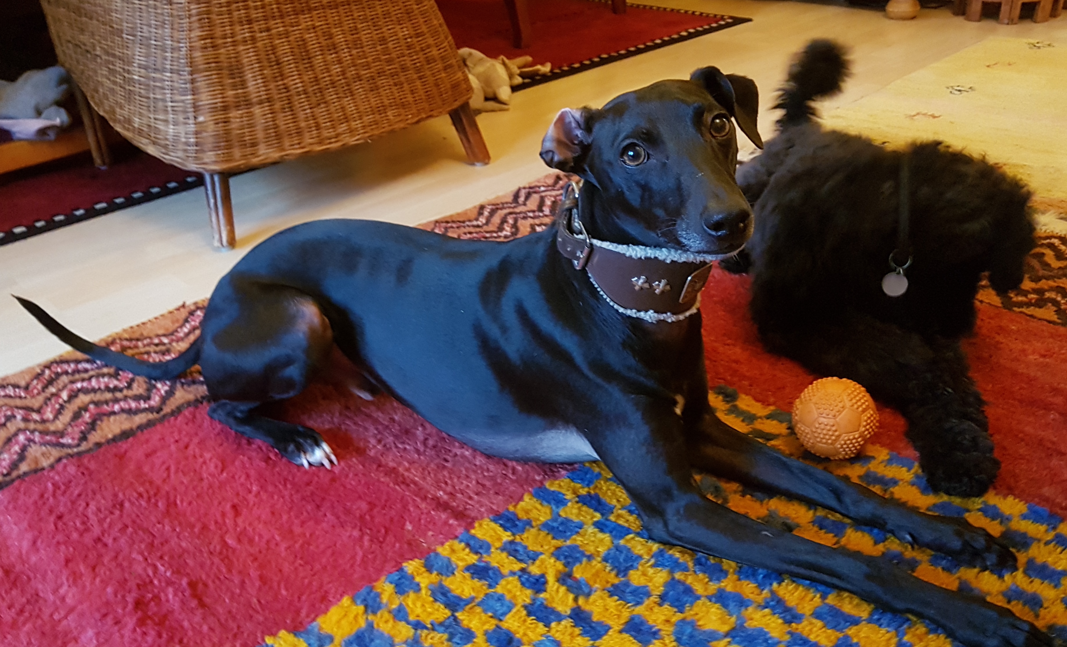 Neu in der Vermittlung ist Kalle. Ein 2 Jahre alter kastrierter Whippet-Windspiel-Mix-Rüde in lackschwarz.