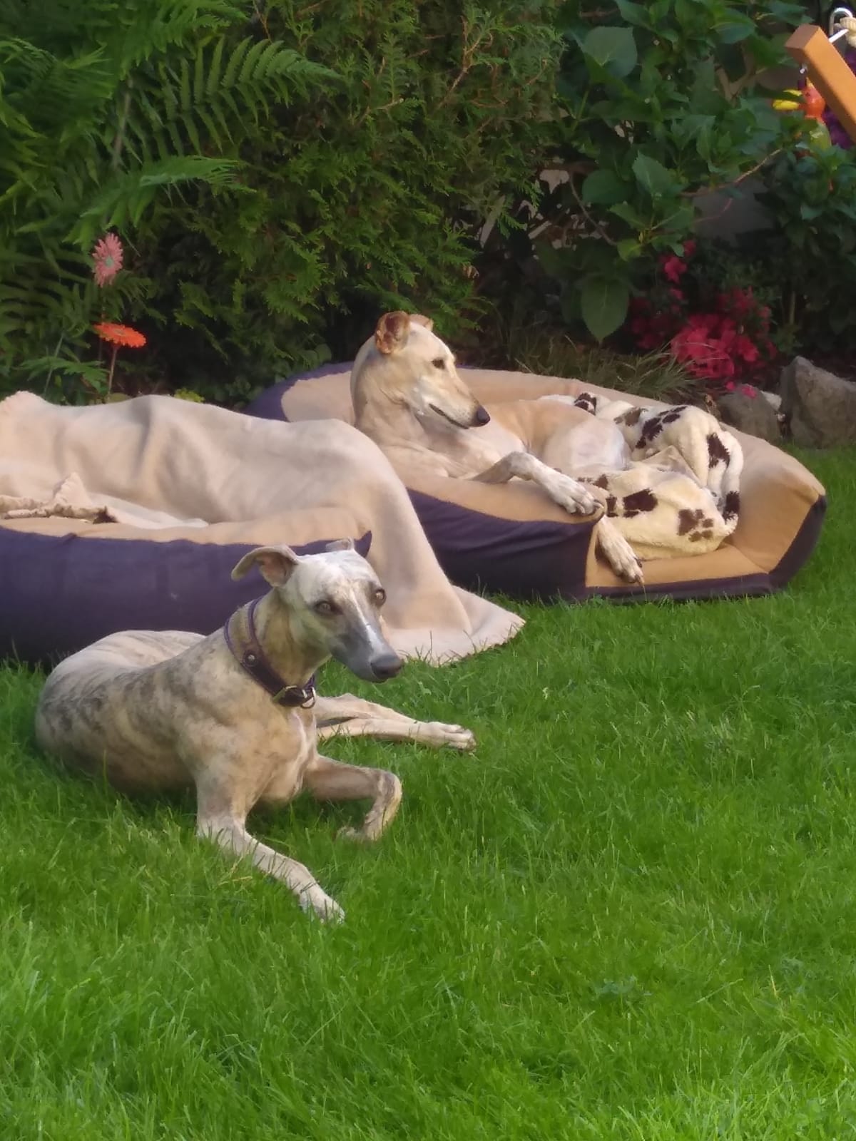 Fakt ist, sie ist ganz glücklich, dass unsere tapfere Saluki-Hündin Sugar mal wieder den Babysitter macht (Privathund zu sein mit Frauchen, das an und zu Tierschutzarbeitsanfälle bekommt, ist ganz schön anstrengend). Sugar gibt ihr Sicherheit und bietet natürlich liebenswürdige Gesellschaft.